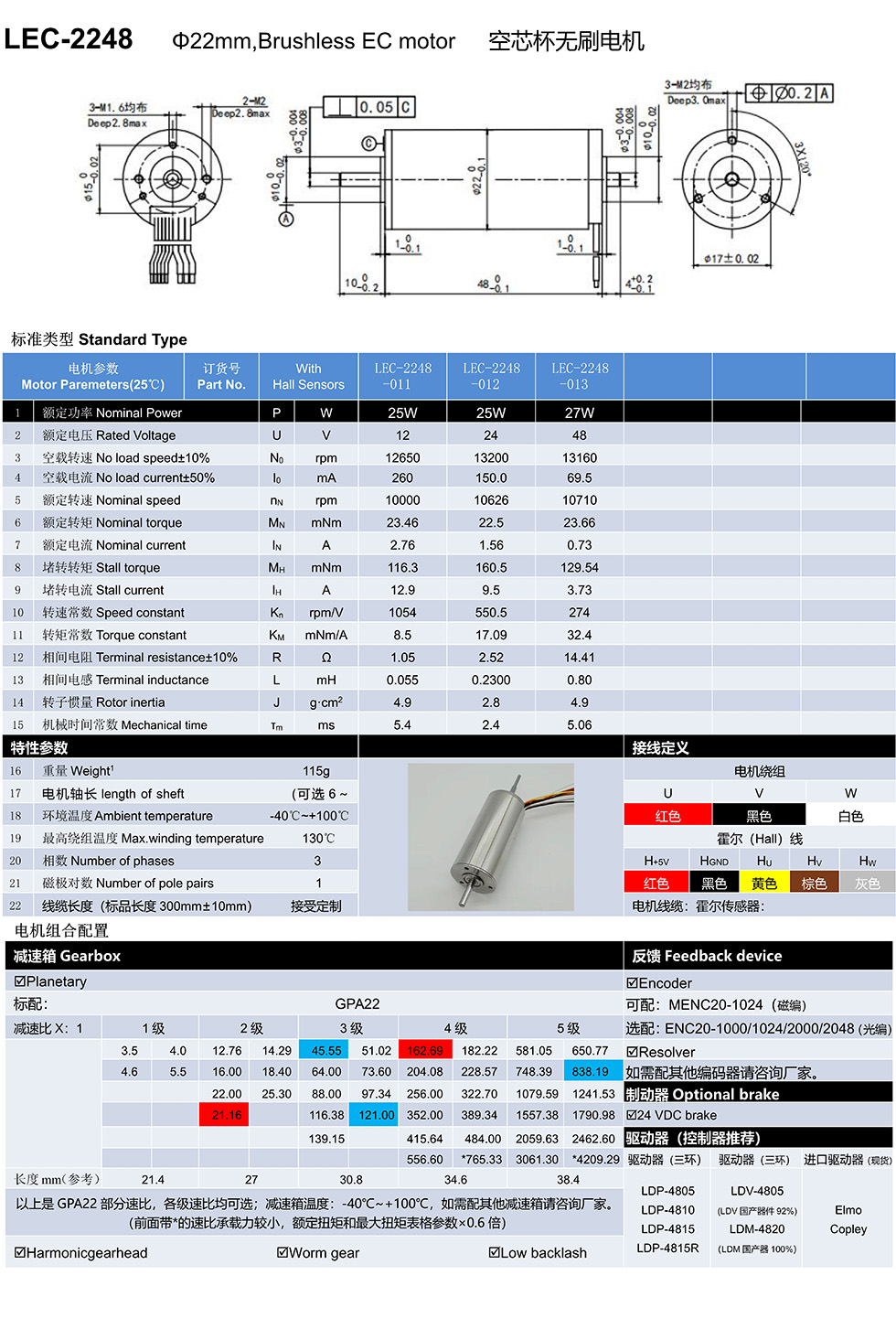 电子换向式LEC系列空芯杯无刷电机具有良好的转矩特性、高转速、更高的响应更宽的转速范围和超长寿命,较高的性价比,适合大多数应用场合。